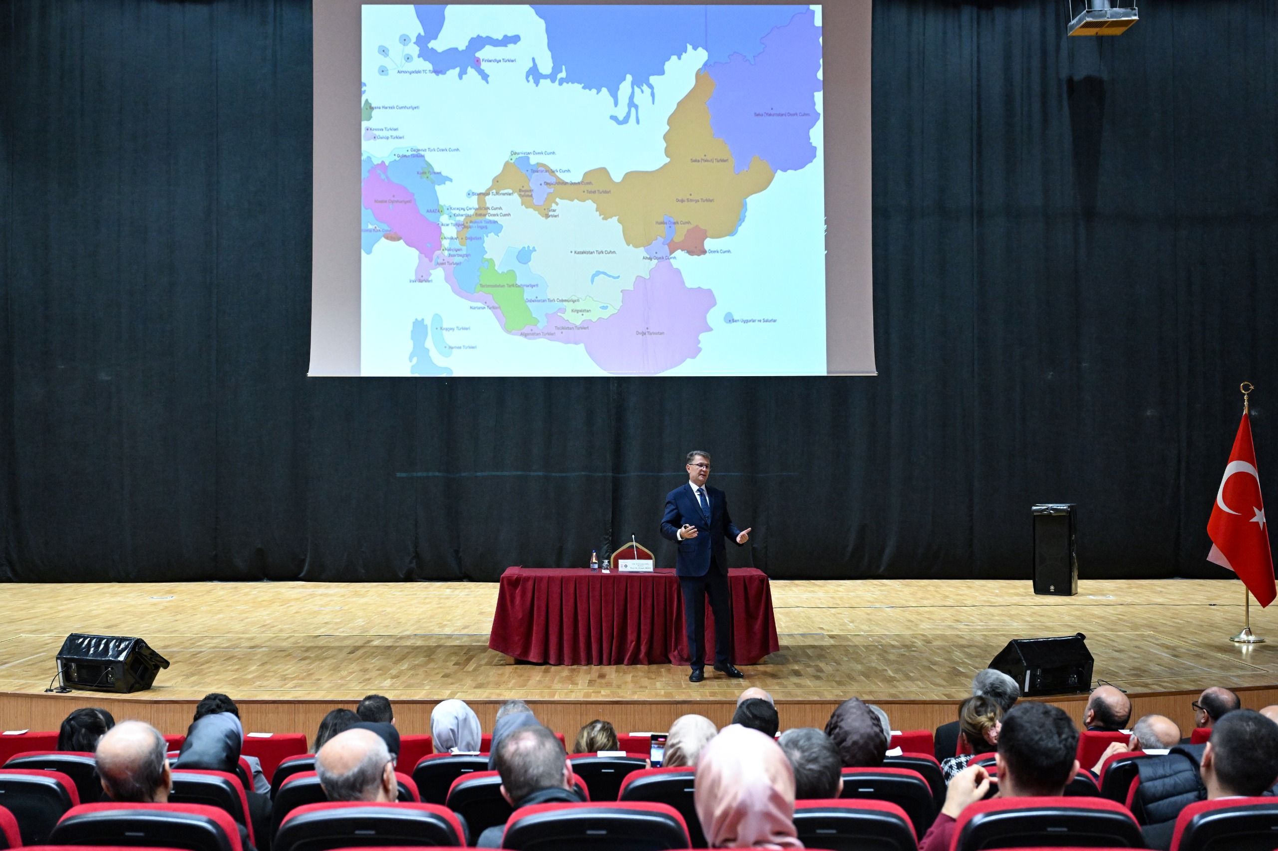 Türk Dil Kurumu Başkanı Prof. Dr. Osman Mert ise “Dünya Türk Dili Ailesi Günü” başlıklı konferansında kimlik, kültür ve millet kavramları üzerinde durdu. Türk dilinin tarihsel serüvenine ilişkin kapsamlı bilgiler paylaşan Prof. Dr. Mert, Saka döneminden Köktürk, Uygur ve Karahanlı dönemlerine uzanan yazıtlar ve kültürel izler hakkında değerlendirmelerde bulundu. Türk kültüründe kullanılan damgalar, semboller ve ses değerlerinin tarihsel anlamlarını aktaran Türk dünyasının kültürel bütünlüğüne vurgu yapan Prof. Dr. Mert, yürütülen kazı çalışmaları ve planlanan sergi projelerine ilişkin de bilgiler paylaştı.