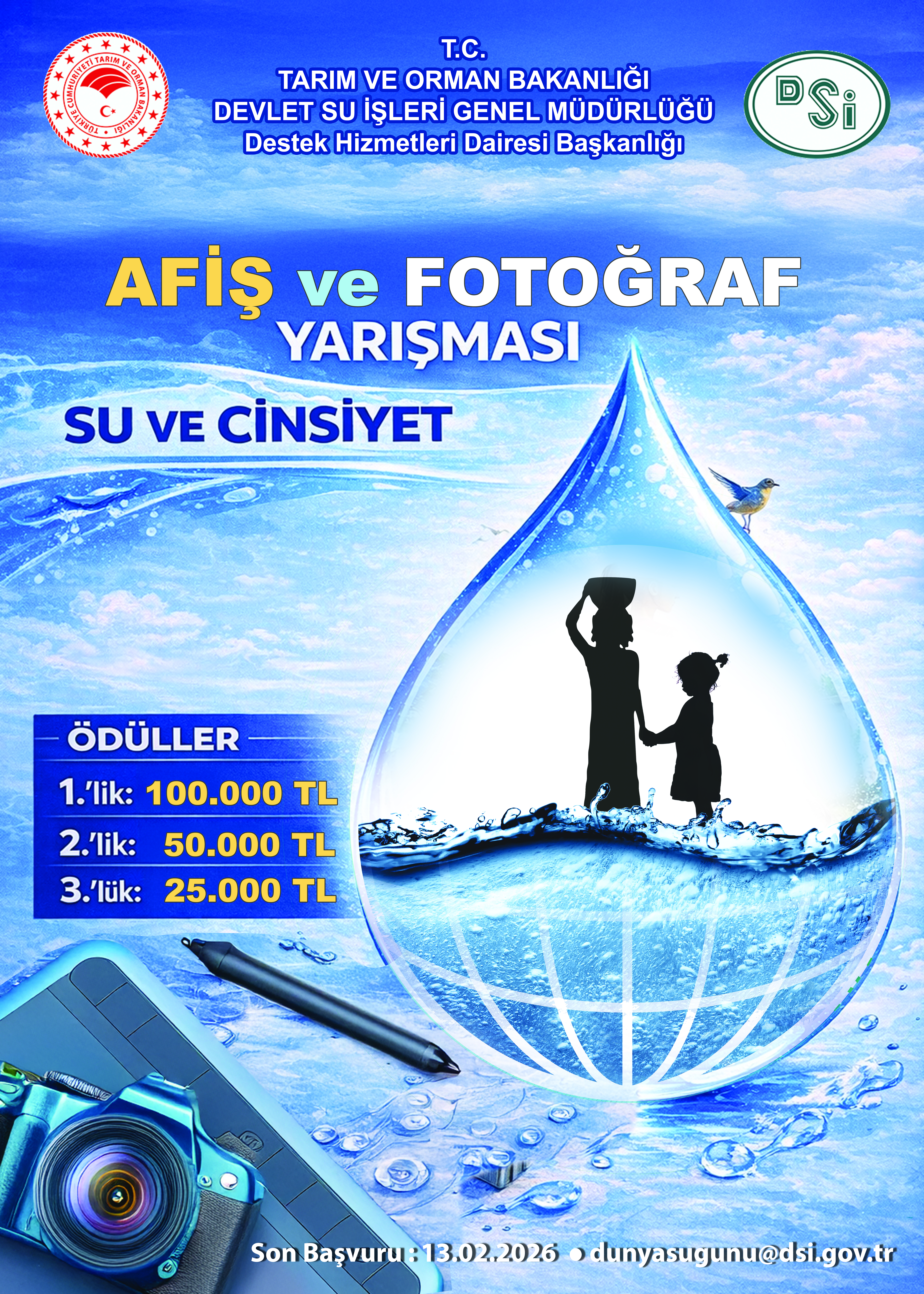 22 Mart Dünya Su Günü kapsamında, Birleşmiş Milletler tarafından 2026 yılı teması “Su ve Cinsiyet” olarak belirlenmiştir. Güvenli su, sanitasyon ve hijyen (WASH) hizmetlerine erişimde yaşanan eşitsizliklerin özellikle kadınlar ve kız çocukları üzerindeki etkilerine dikkat çekmek amacıyla, “Su ve Cinsiyet” temalı Afiş, Fotoğraf ve Kısa Film Yarışması düzenlenecektir. Yarışmaya isteyen herkes katılabilecek olup, eserlerin 13 Şubat 2026 tarihine kadar katılım formu ve muvafakatname ile birlikte dunyasugunu@dsi.gov.tradresine gönderilmesi gerekmektedir. Yarışmaya ilişkin ayrıntılı bilgiler www.dsi.gov.tr adresinde ve ekli şartnamede yer almaktadır.