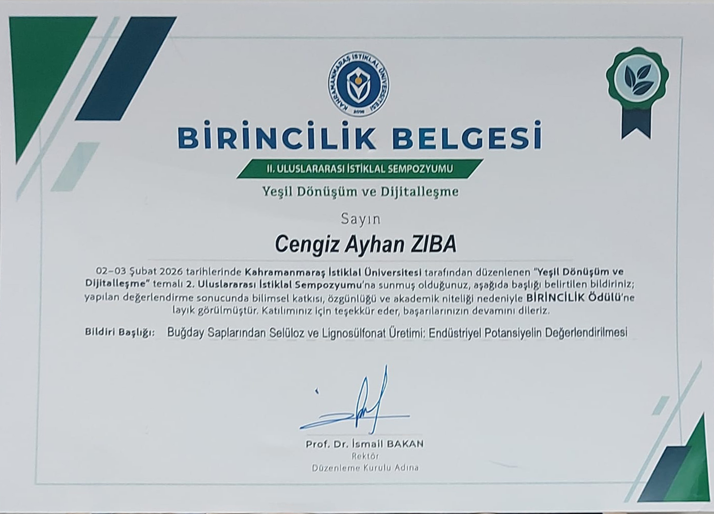 Afşin Meslek Yüksekokulu akademik personelimiz Dr. Öğr. Üyesi Cengiz Ayhan ZIBA, Yeşil Dönüşüm ve Dijitalleşme temalı II. Uluslararası İstiklal Sempozyumunda sunmuş olduğu "Buğday Saplarının Selüloz ve Lignosülfonat Endüstriyel Potansiyelin Değerlendirilmesi" çalışması ile birincilik ödülüne layık görülmüştür.