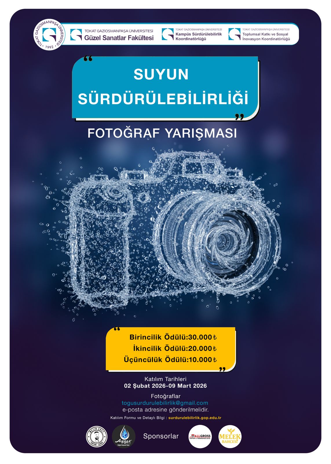 İklim krizi ve çevresel faktörler nedeniyle su kaynaklarımızın korunması, günümüzün en stratejik sorumluluklarından biri haline gelmiştir. Bu kapsamda Tokat Gaziosmanpaşa Üniversitesinde; suyun sürdürülebilirliğini kültürel ve etik bir sorumluluk alanı olarak ele almak, sanatsal bakış açısıyla toplumsal duyarlılık geliştirmek ve BM Sürdürülebilir Kalkınma Amaçları (SKA 6) doğrultusunda çevresel bilinç oluşturmak amacıyla ulusal ölçekte ödüllü "Suyun Sürdürülebilirliği" fotoğraf yarışması düzenlemektedir. Tokat Gaziosmanpaşa Üniversitesi Güzel Sanatlar Fakültesi, Kampüs Sürdürülebilirlik Koordinatörlüğü ile Toplumsal Katkı ve Sosyal İnovasyon Koordinatörlüğü tarafından "Dünya Su Günü" etkinlikleri kapsamında, sanatın dönüştürücü potansiyelini kullanarak farkındalık yaratmak maksadıyla düzenlenen yarışma, ulusal ölçekte tüm katılımcıların başvurularına açık olup; yarışma şartnamesi ve başvuru detaylarına surdurulebilirlik.gop.edu.tr internet sayfasından ulaşılabilmektedir. Yarışmaya başvurular 02.02.2026 - 09.03.2026 tarihleri arasında gerçekleştirilecektir.
