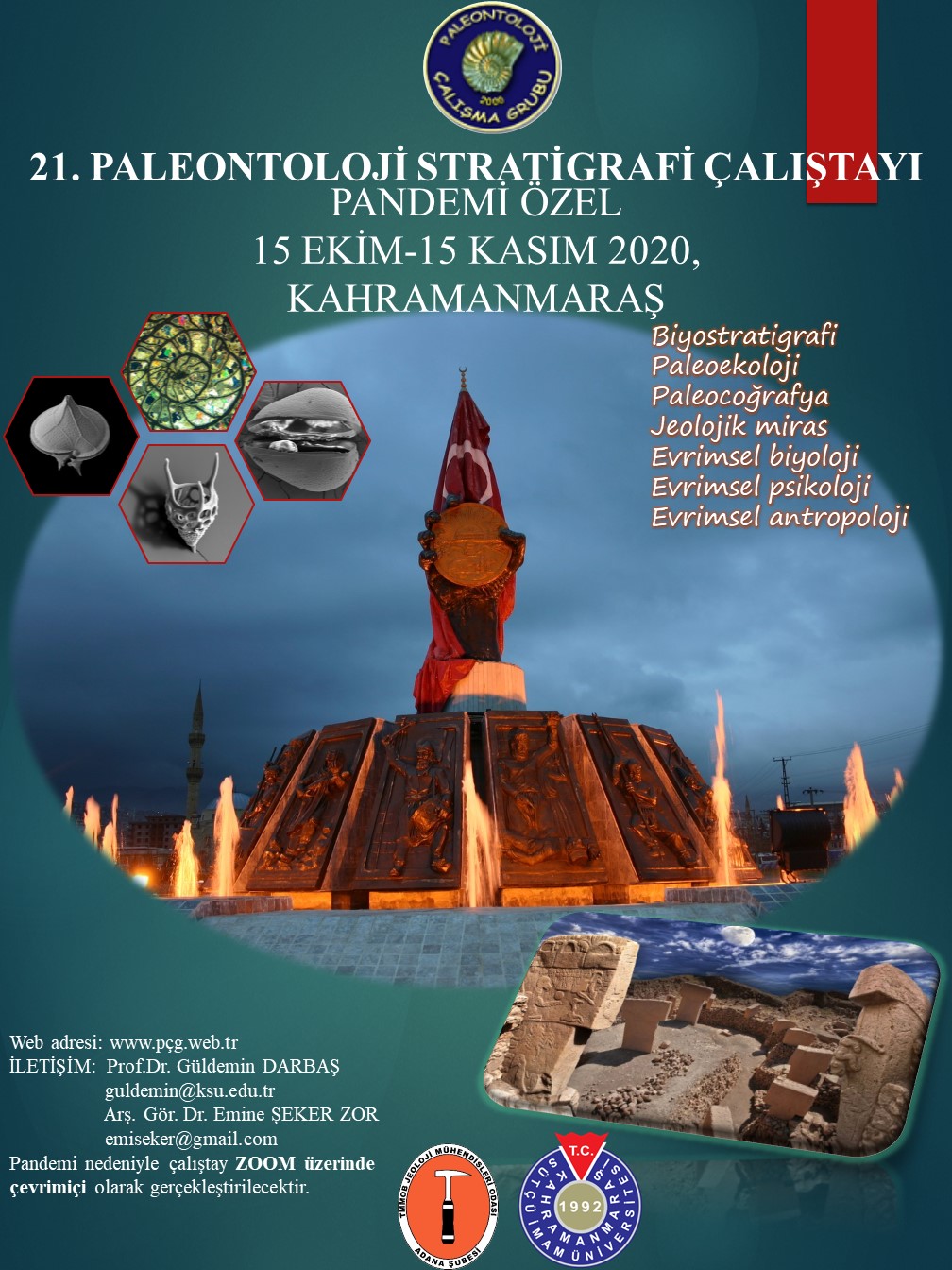 21.Paleontoloji Stratigrafi Çalıştayı (21. PÇG), Kahramanmaraş Sütçü İmam Üniversitesi Jeoloji Mühendisliği Bölümü ev sahipliğinde 15 Ekim-15 Kasım 2020 tarihleri arasında Türkiye Jeoloji Mühendisleri Odası’nın katkılarıyla “ZOOM” programı üzerinden “ÇEVRİMİÇİ” olarak gerçekleştirilecektir. Gelen bildiri sayı ve sürelerine göre haftada ikişer saat ve iki oturum şeklinde gerçekleştirilmesi planlanan Çalıştay’ın programı PÇG web sayfasında duyurulacak olup konuya ilgi duyan herkese açıktır. Jeoloji Mühendisliği Bölümünü tebrik eder. Etkinliklerinin devamı ve başarılı geçmesini dileriz