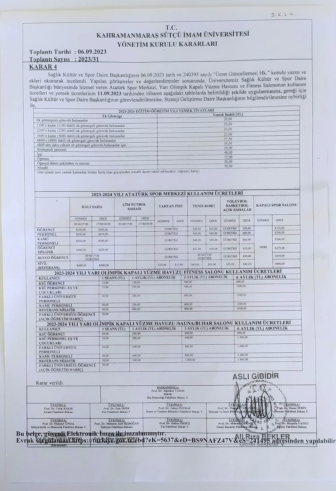 20230-2024 Eğitim-Öğretim Yılı Yemek Ücretleri ve Spor Tesisleri Ücretleri