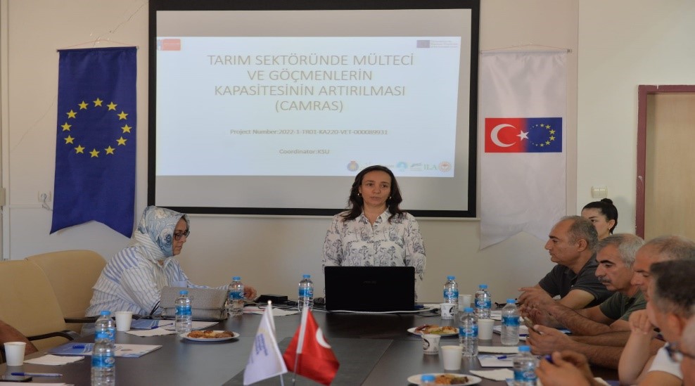Kahramanmaraş Sütçü İmam Üniversitesi (KSÜ) Tarımsal Yayım Araştırma ve Uygulama Merkez Üyesi Prof. Dr. Emine İKİKAT TÜMER’in koordinatörlüğünü yaptığı Erasmus+ Mesleki Eğitim Stratejik Ortaklıklar (KA204) kapsamında Avrupa Birliği tarafından finanse edilen CAMRAS “Increase The Capacity of Migrant and Refugees in Agriculture Sector” başlıklı projenin “Göçmen ve Mülteciler için Etkili Bir Tarım Rehberi” konulu workshop toplantısı KSÜ ÜSKİM toplantı salonunda gerçekleştirildi.