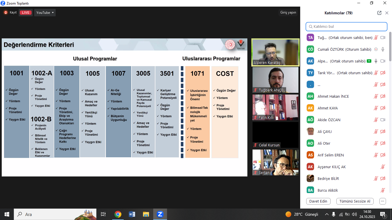 Bu kapsamda, 24 Ekim 2023 tarihinde saat 14:00'da Zoom uygulaması üzerinden TÜBİTAK Sosyal ve Beşeri Bilimler Araştırma Destek Grubu Bilimsel Programlar Koordinatörü Sn. Alperen KARATAŞ tarafından Üniversitemiz öğretim elemanlarına özel olarak hem "Deprem Bölgesi Üniversiteleri Özel Çağrısı- BİNBİRÇABA" çağrısı hem de ARDEB kapsamında desteklenen diğer çağrılar (1000, 1001, 1002, 1003, 1004, 1005, 1007, 1071, 2500, 3005 ve 3501) hakkında ARDEB Tanıtım Sunumu gerçekleştirilmiştir.