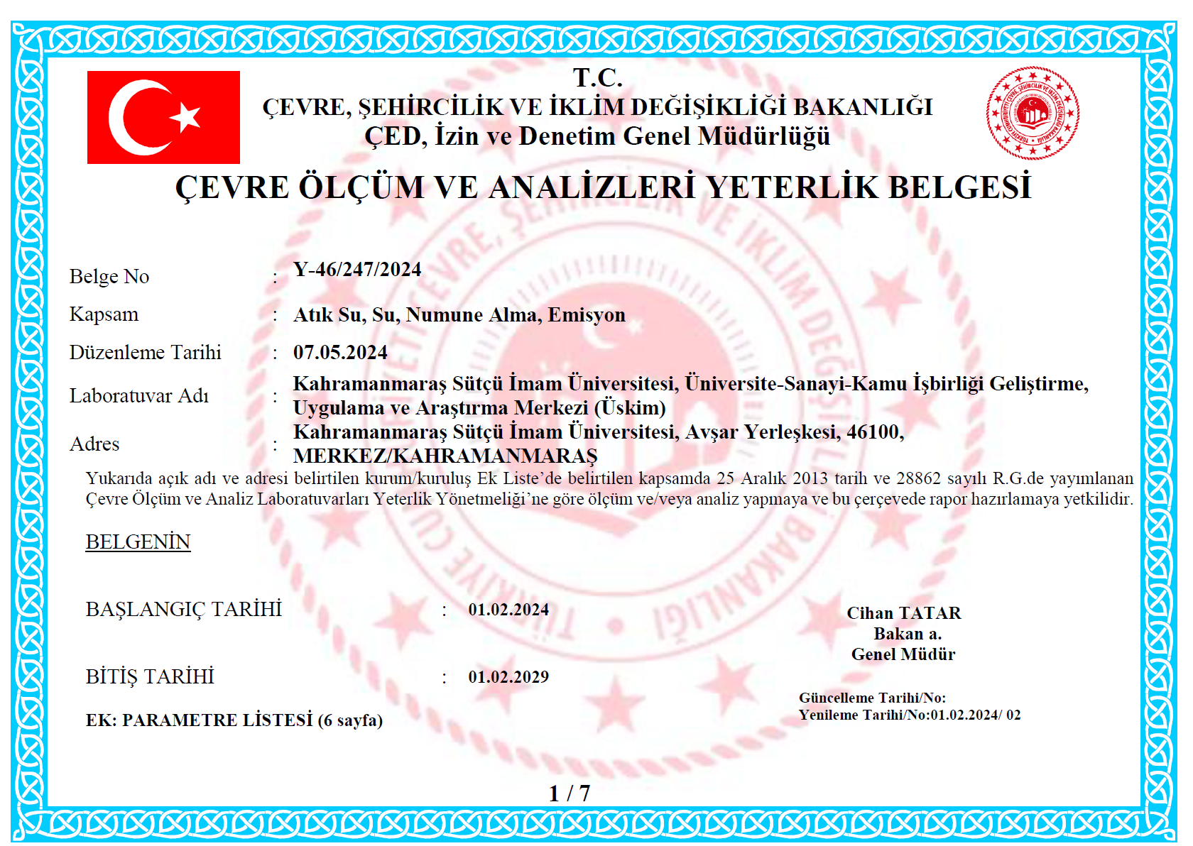 Üniversitemizin 2009 yılında kurulan ve Çevresel Faaliyetler Alanlarında 2012’den beri Çevre Şehircilik ve İklim Değişikliği Bakanlığı tarafından alınan "Çevre Ölçüm ve Analizleri Yeterlilik Belgesi"ne sahip olan ÜSKİM, belge geçerlilik süresini 2024-2029 olacak şekilde tekrar yenilemiştir! Bu belge sayesinde birimimiz Sanayi Kaynaklı Hava Kirliliği Kontrol Yönetmeliği (SKHKK) ve Su Kirliliği Kontrolü Yönetmeliği (SKK) uyarınca yetki kapsamında olan parametrelerde bölgemizde işletmelerde ölçüm yapma ve raporlama faaliyetlerine devam edecektir.
