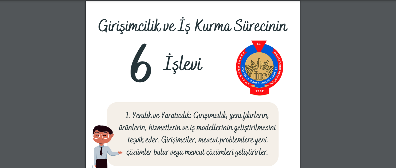 Fakültemizde uygulanmaya başlanan Stratejik Kalite Yönetimi (SKY) Eylem Planına ilişkin "İ.1.1. Girişimcilik kavramını tanımlayan ve işlevlerini açıklayan materyaller oluşturulması" faaliyeti kapsamında girişimcilik ve iş kurma süreçlerine ilişkin temel altı işlev belirlenmiş ve infografik olarak sunulmuştur.