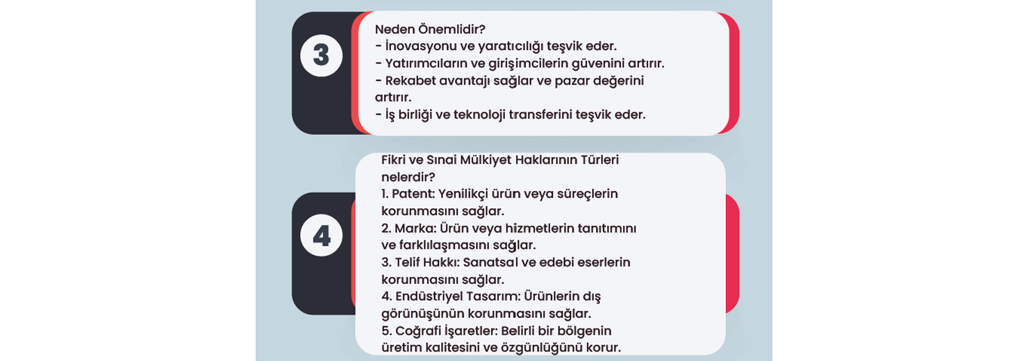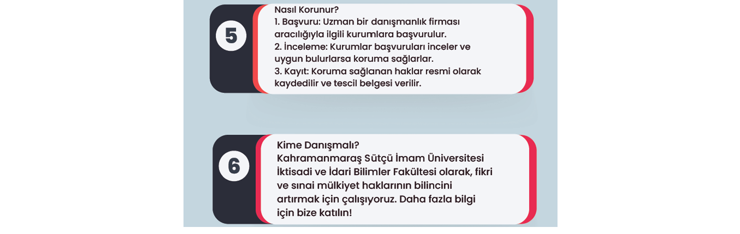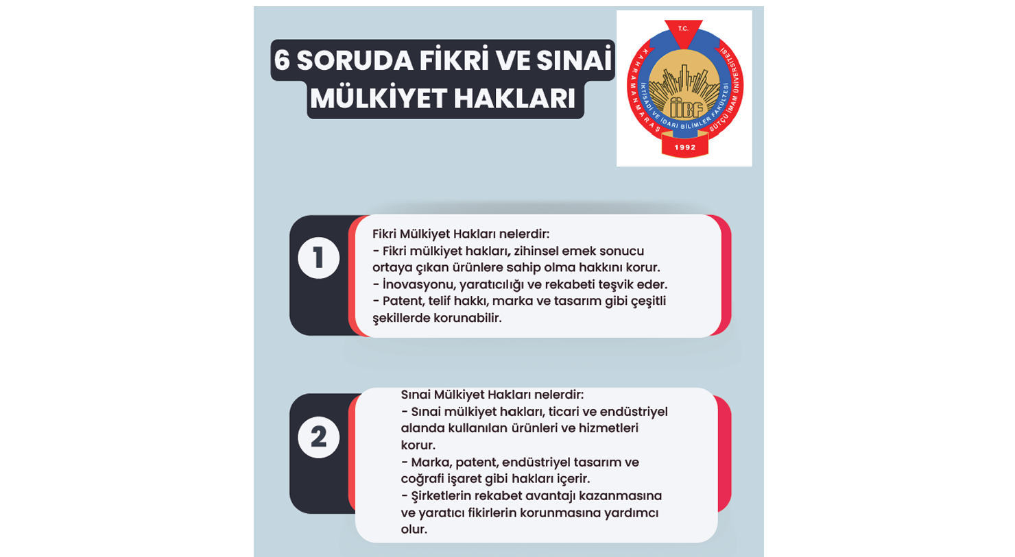 Fakültemiz 2023 KİDR kapsamında uygulanmaya başlayan Stratejik Kalite Yönetimi (SKY) Eylem Planı kapsamında "J.2. Ortaya çıkarılan ürün ve fikri hakların tescil edilmesine yönelik eylemler" eyleminin alt faaliyeti olan "J.2.1. Fakültede Fikri ve Mülkiyet Hakları üzerine farkındalığın artırılması" faaliyetinin gerçekleştirilmesi için hazırlanan infografik aşağıda sunulmuştur.