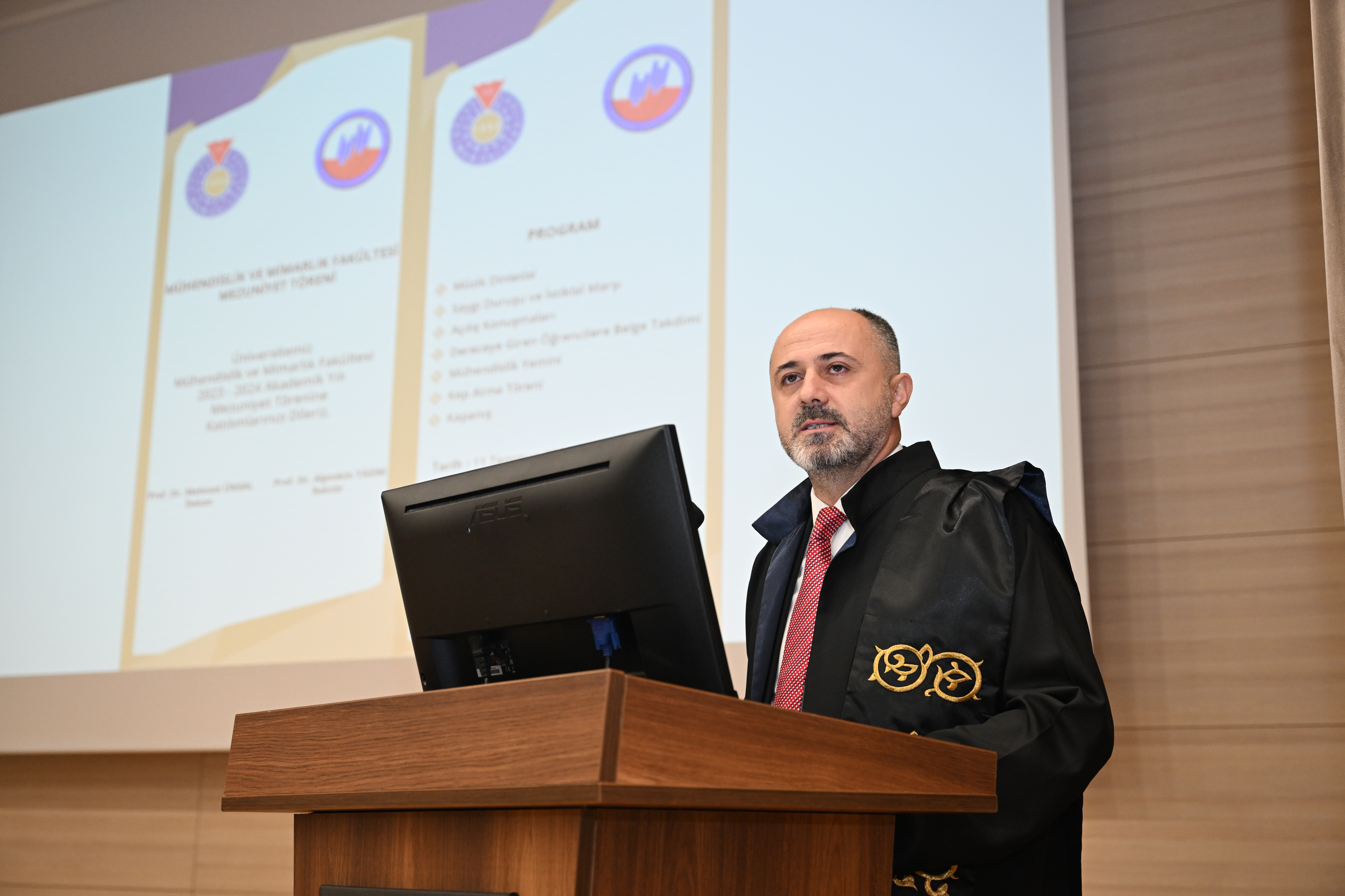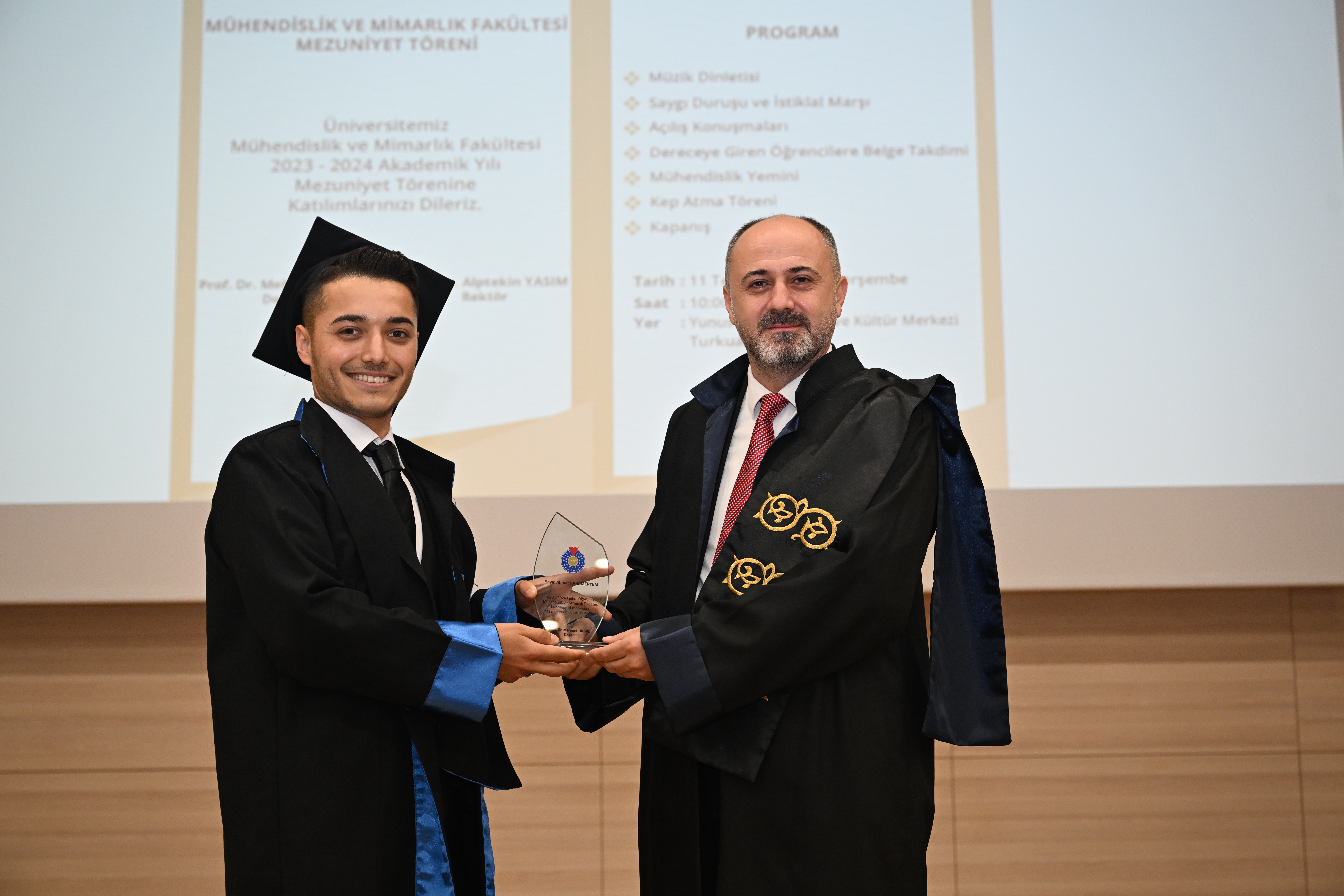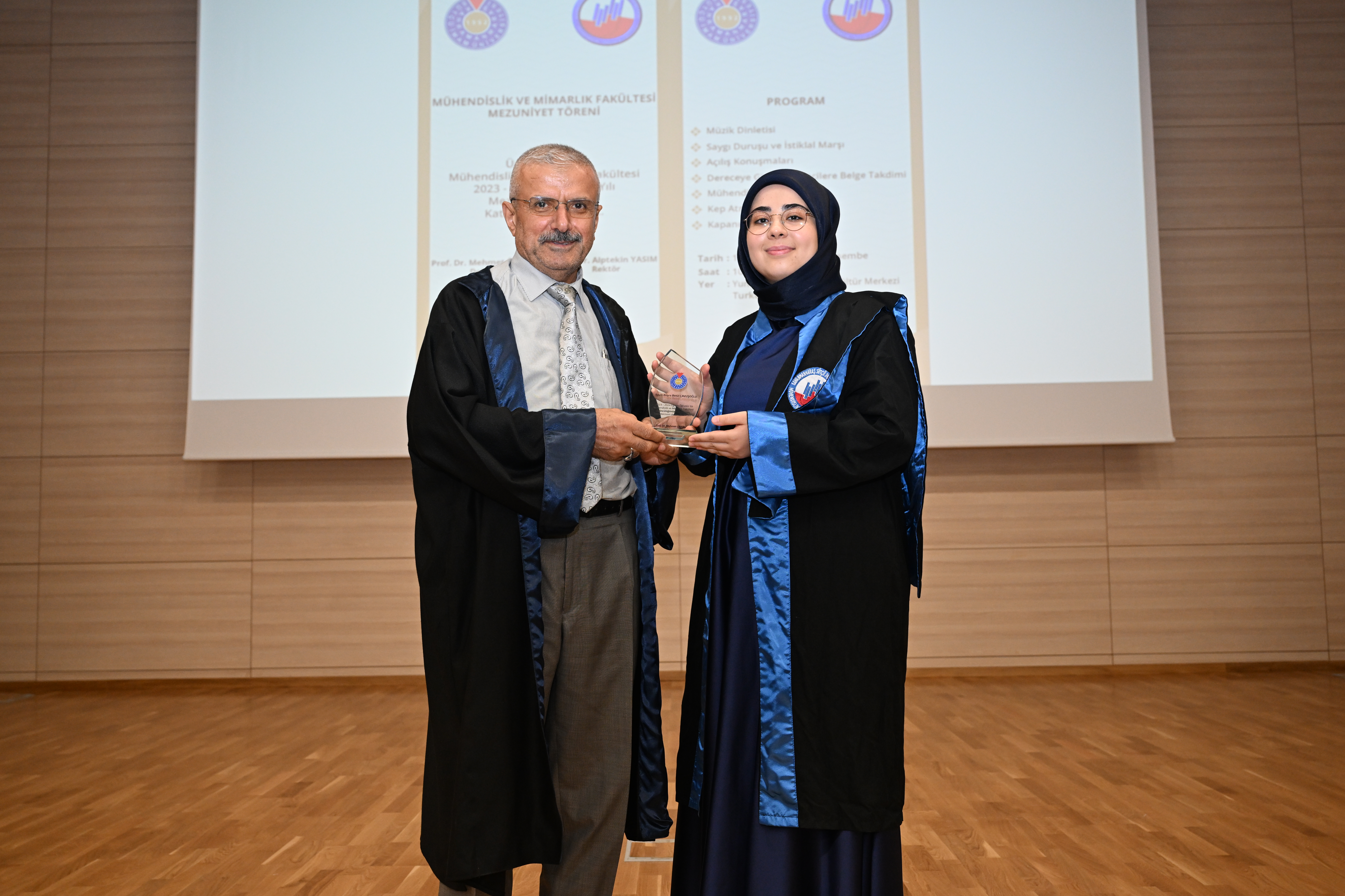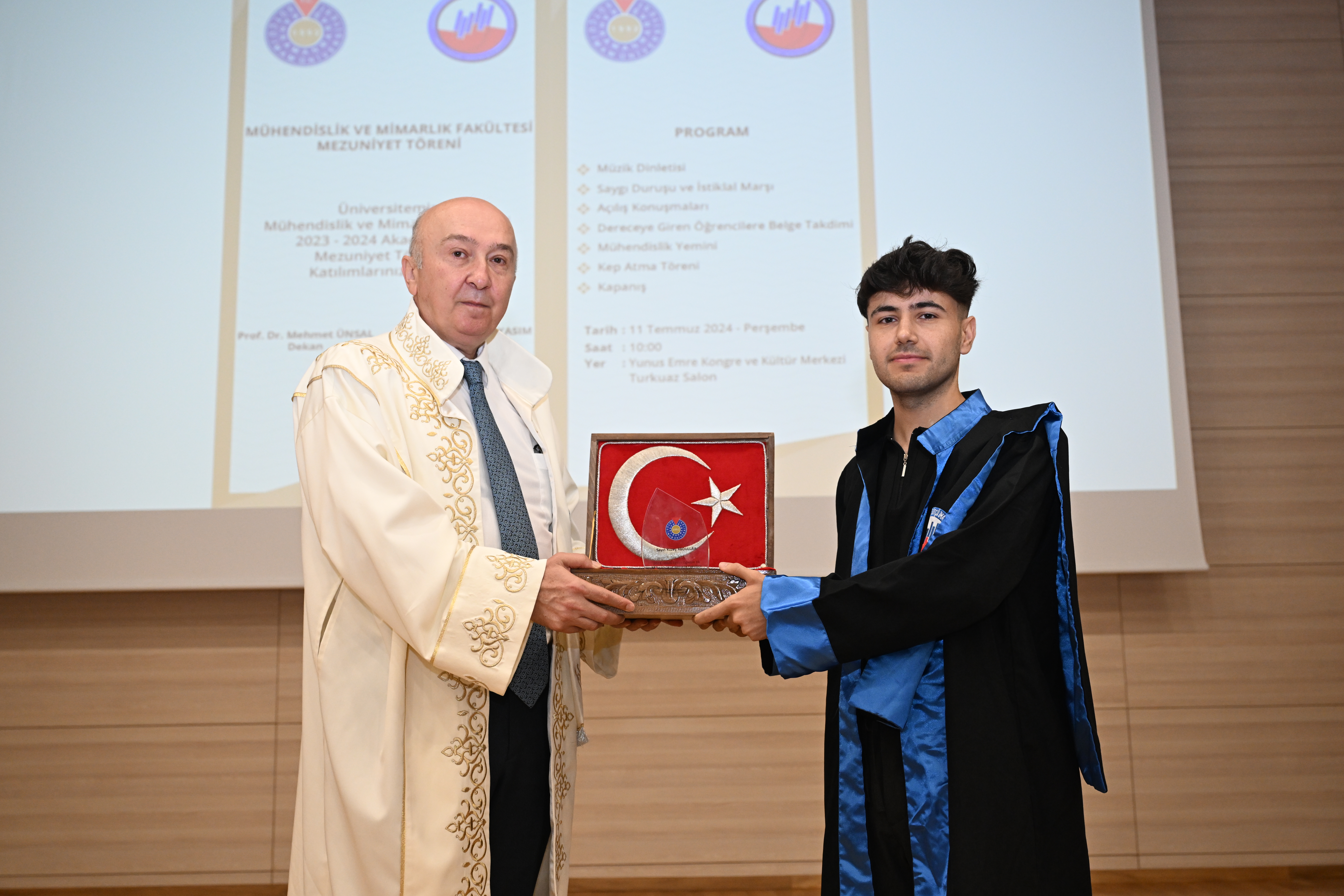 Açılış konuşmalarının ardından 2023-2024 Akademik Yılı Mühendislik ve Mimarlık Fakültesi dönem birincisi elektrik-elektronik mühendisliği bölümü öğrencisi Kuzey Abdullah, fakülte ikincisi elektrik-elektronik mühendisliği bölümü öğrencisi Ahmet Karameryem ve fakülte üçüncüsü bilgisayar mühendisliği bölümü Büşra Betül Çavuşoğlu’na plaket, başarı belgeleri ve hediyeleri protokol üyeleri tarafından verildi.