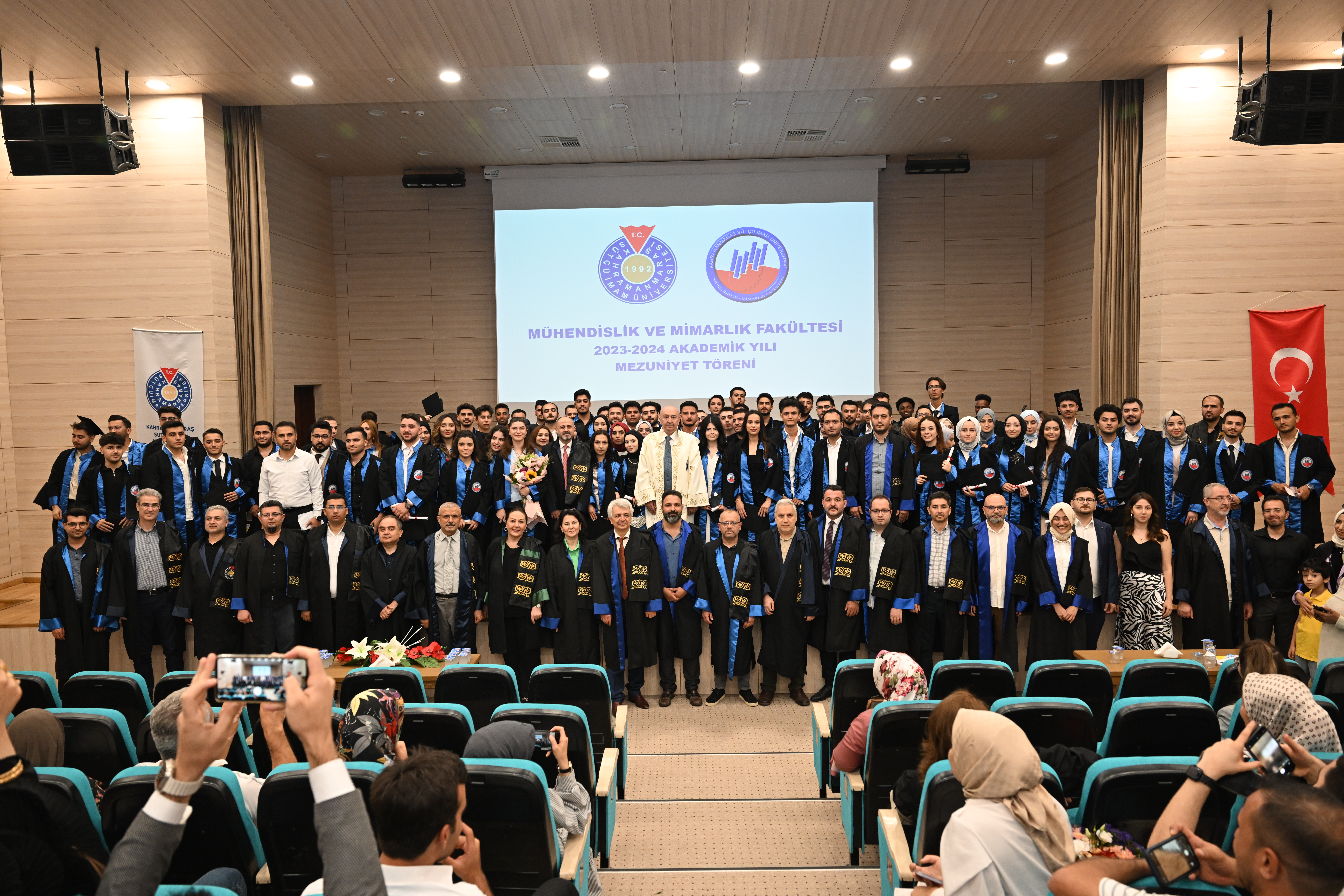 KSÜ Yunus Emre Kongre ve Kültür Merkezinde gerçekleştirilen mezuniyet törenine Rektör Prof. Dr. Alptekin Yasım, Dekan Prof. Dr. Mehmet Ünsal, Mühendislik ve Mimarlık Fakültesi Öğretim Üyeleri, öğrenciler ve aileleri katıldı.
