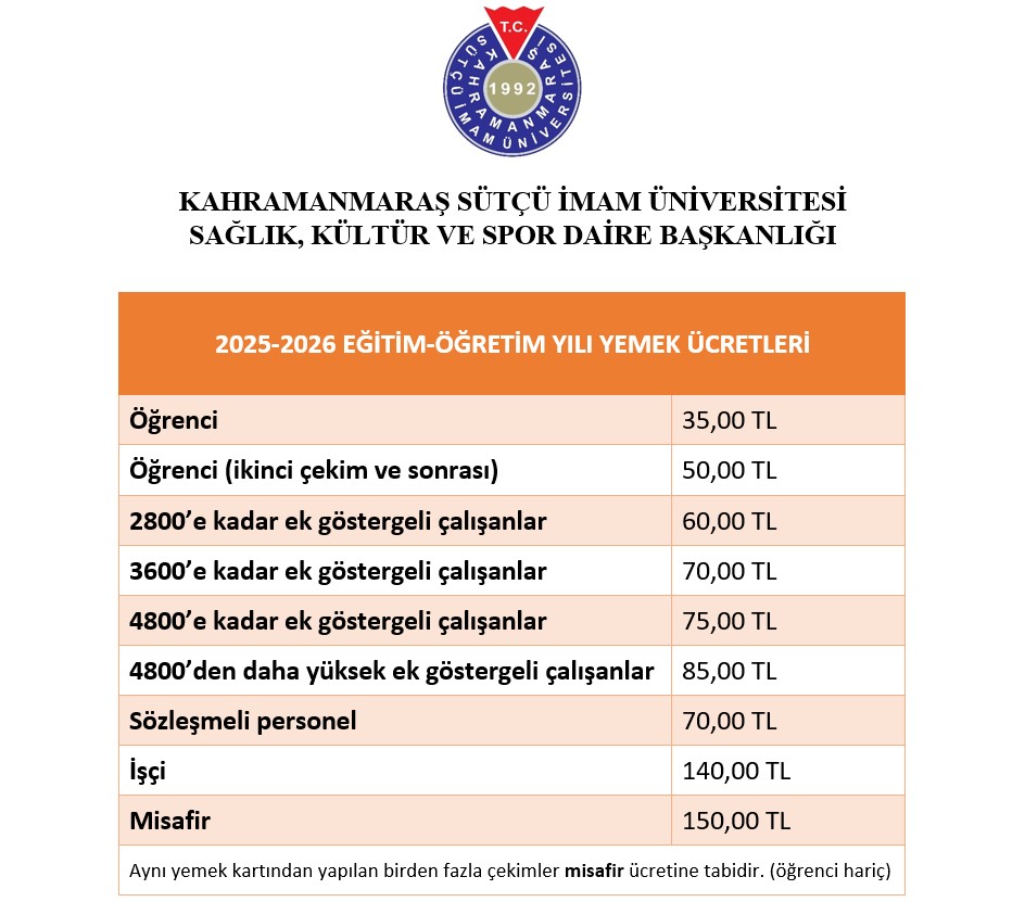 29.09.2025 Tarihinden İtibaren Geçerli Olmak Üzere Yemek Ücretleri Güncellenmiştir.