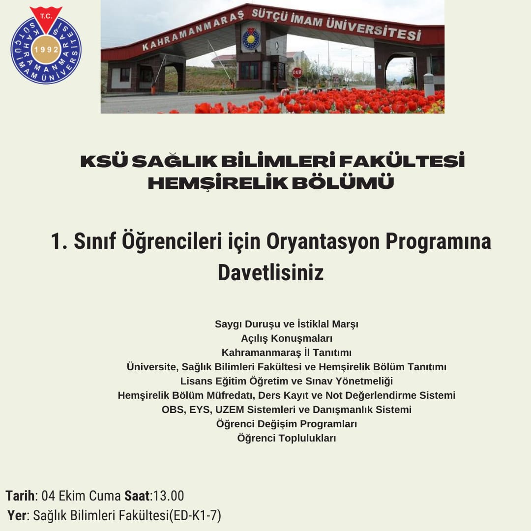 2023-2024 Eğitim Öğretim Yılı 1. Sınıf Öğrencileri için "Oryantasyon Programı" 4 Ekim 2024 tarihinde fakültemizde gerçekleştirilecektir. Program içeriği afişte yer almaktadır: