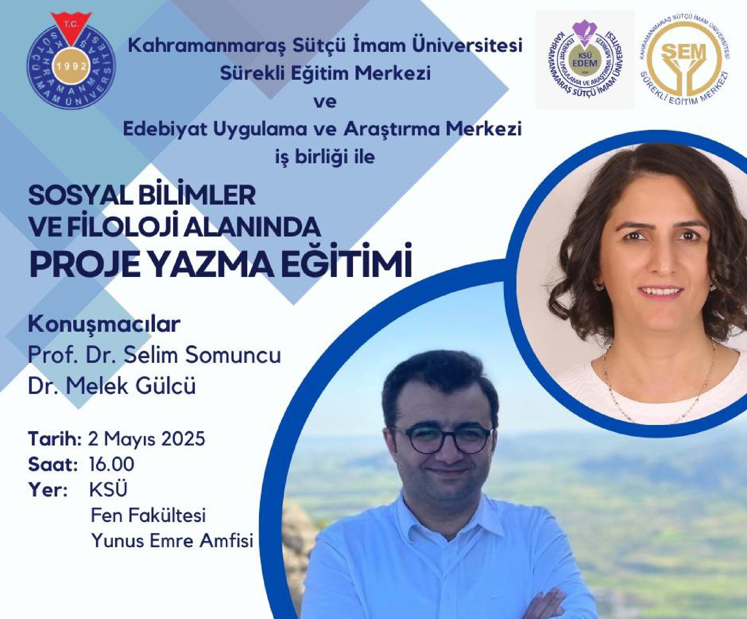 Kahramanmaraş Sütçü İmam Üniversitesi, Sürekli Eğitim Merkezi ve Kahramanmaraş Edebiyat İncelemeleri Uygulama ve Araştırma Merkezi iş birliği "Sosyal Bilimler ve Filoloji Alanında Proje Yazma Eğitimi" gerçekleştirilecektir.