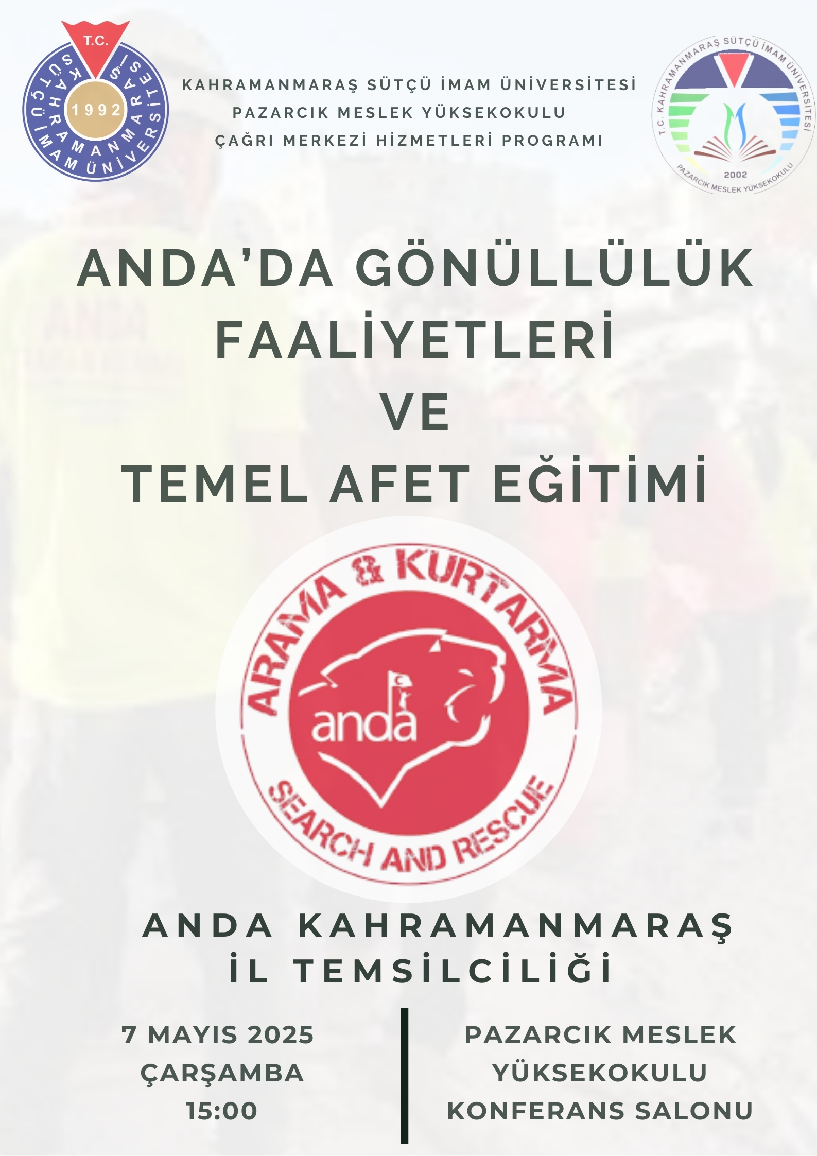 "ANDA'da Gönüllülük Faaliyetleri Konferansı ve Temel Afet Eğitimi" 07 Mayıs 2025 Çarşamba 15:00 - Çağrı Merkezi Hizmetleri Programı Etkinliği