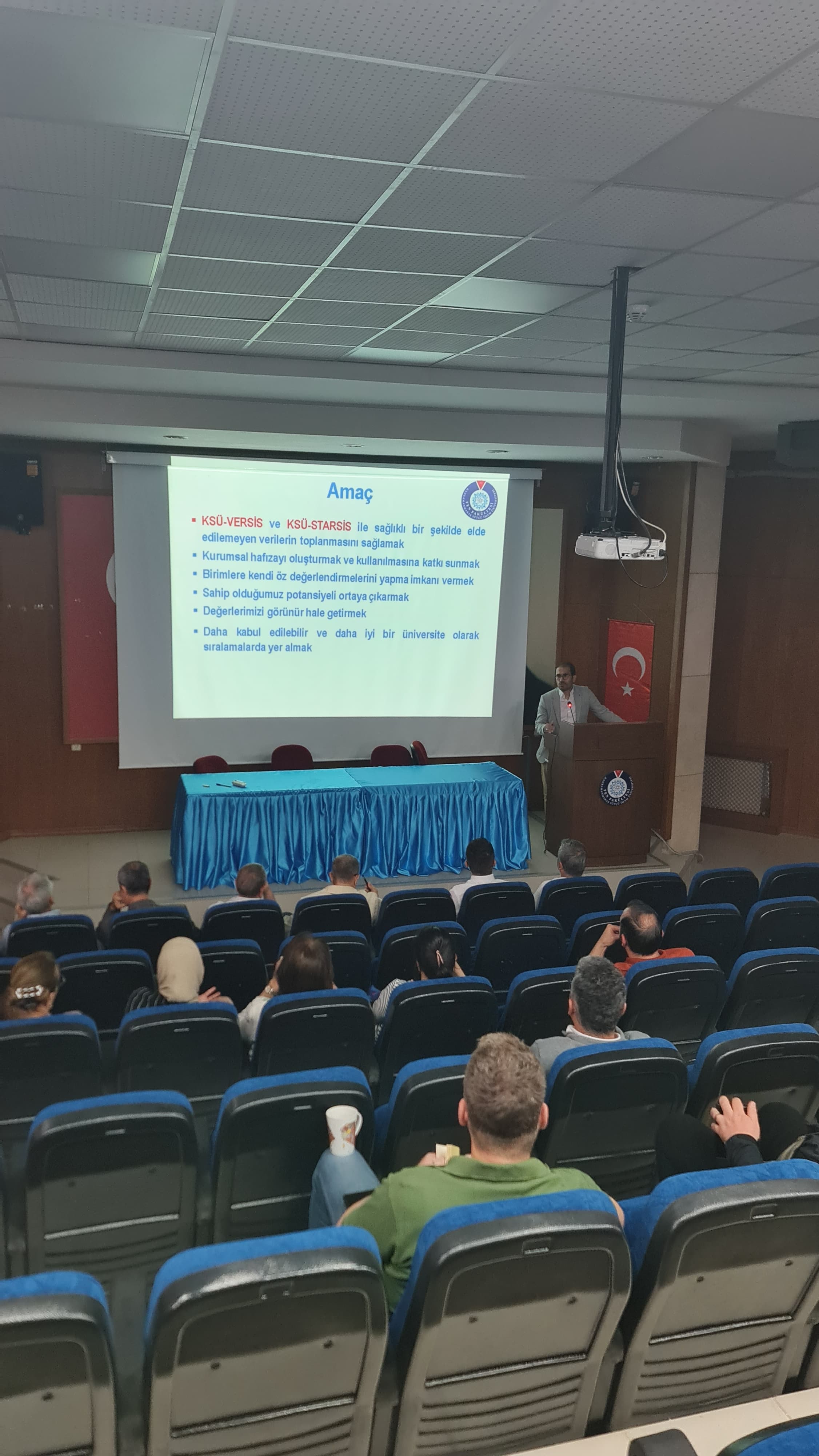 Ardından söz alan Dekan Yardımcısı Dr. Öğr. Üyesi Abdullah AKKURT, “KSÜ Birim Performans Değerlendirmesi” başlıklı bir sunum gerçekleştirdi. Sunumda; fakültenin hak ettiği akademik sıralamalarda yer alabilmesi, ulusal ve uluslararası indekslerde görünürlüğünün artırılması ve tercih edilebilir, saygın bir yükseköğretim kurumu haline gelmesi için yapılan her türlü faaliyetin sistemli bir şekilde izlenmesi ve kanıtlandırılması gerektiğinin altını çizdi.
