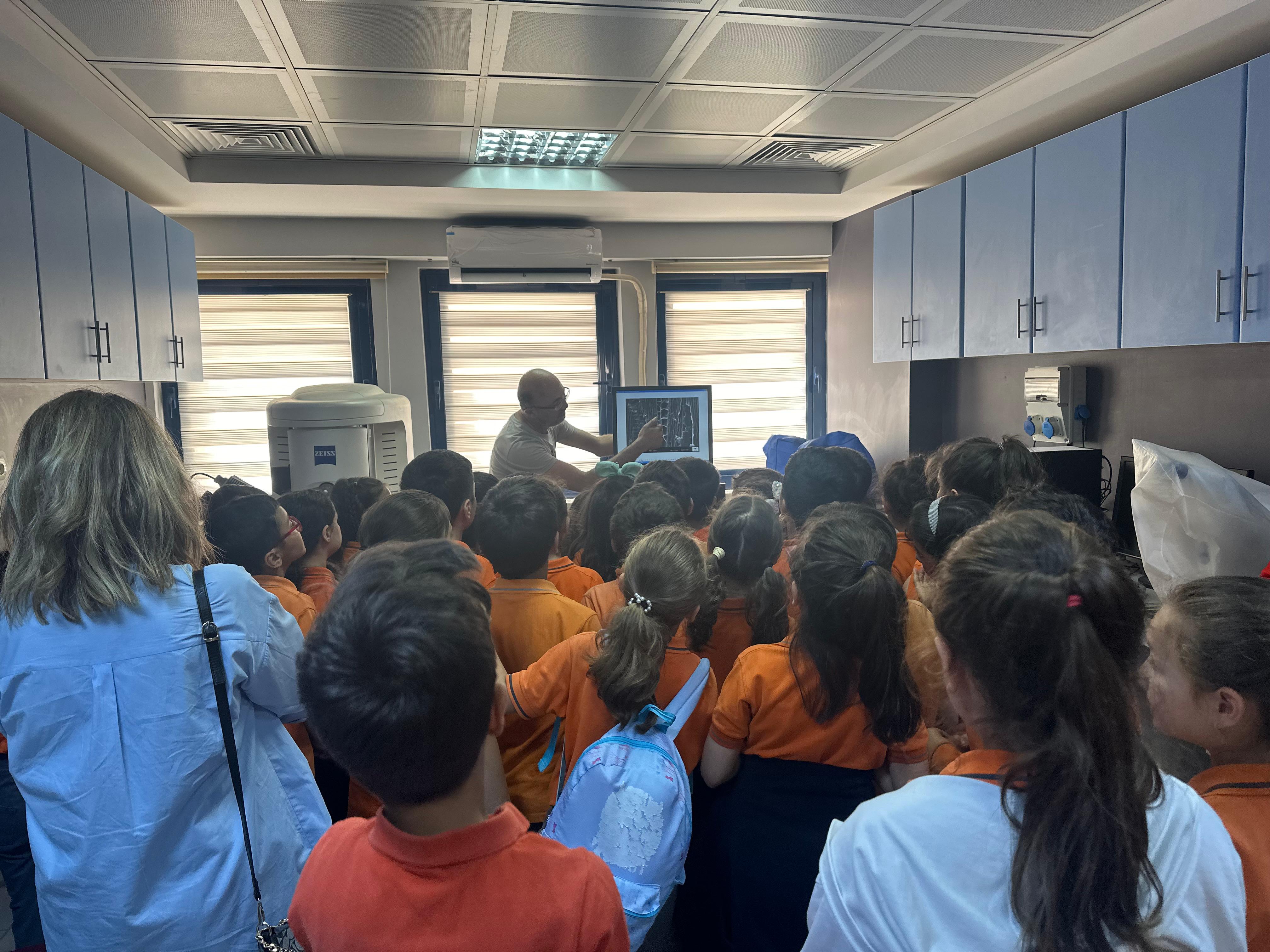 Kahramanmaraş İsmail Kurtul İlkokulu’ndan yaklaşık 40 öğrenciden oluşan bir grup, ÜSKİM laboratuvarlarını ziyaret etti. Ziyaret kapsamında öğrenciler, laboratuvar ortamını yakından tanıma fırsatı buldu. Uzman personel eşliğinde laboratuvar cihazları tanıtıldı, çalışma prensipleri hakkında bilgi verildi. Eğitici ve keyifli anların yaşandığı etkinlikte, çocukların bilime olan ilgisinin arttırılması ve erken yaşta farkındalık kazanmaları hedeflendi.
