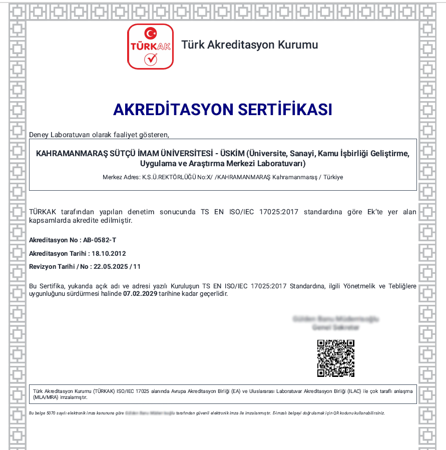 2012 yılından bu yana Çevre ve Tekstil analizleri alanında akredite hizmet sunan ÜSKİM, ayrıca Türkiye genelinde emisyon ölçüm yetkinliğine sahip toplam 233 laboratuvar arasında, üniversite altyapısına sahip yalnızca 7 laboratuvardan biri olma ayrıcalığına sahiptir. Kahramanmaraş Sütçü İmam Üniversitesi/ÜSKİM Laboratuvarı, kamu kaynaklı akademik yapısı ve teknik donanımıyla dikkat çekmektedir. 2024 yılı itibarıyla ise Gıda analizleri alanında da kapsam genişletme sürecini başarıyla tamamlayarak hizmet alanını daha da genişletmiştir. Bu gelişmeyle birlikte laboratuvarımızın akredite parametre sayısı 63’e ulaşmıştır.