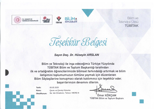Kahramanmaraş Sütçü İmam Üniversitesi (KSÜ) Fen Fakültesi Fizik Bölümü Öğretim Üyesi Doç. Dr. Hüseyin ARSLAN, 05 Mayıs 2025 tarihinde Mersin Tarsus Sağlıklı Orta Okulunda TÜBİTAK Bilim Söyleşileri kapsamında öğrencilerle bir araya geldi.