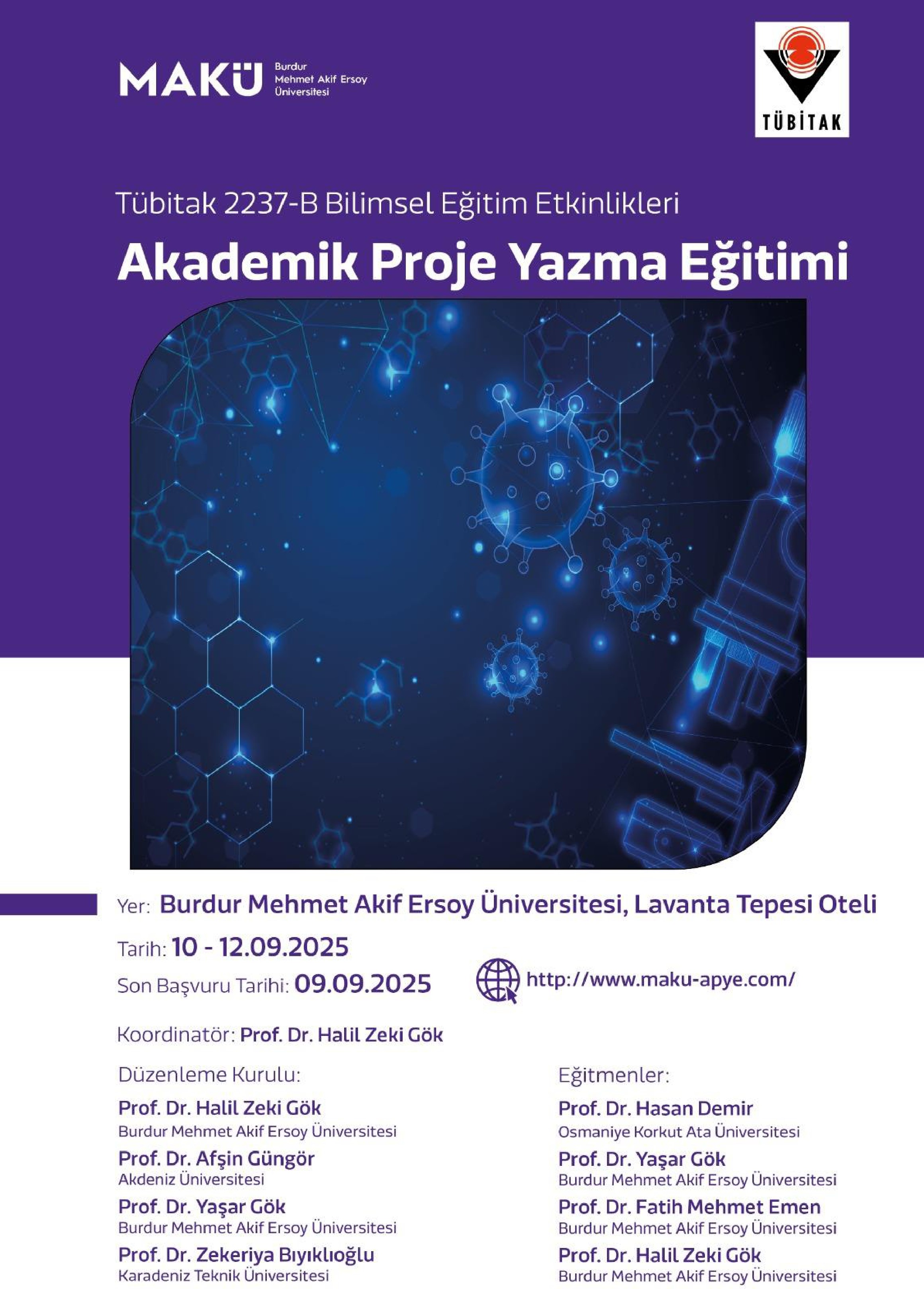 Burdur Mehmet Akif Ersoy Üniversitesi Fen Edebiyat Fakültesi Kimya Bölümü Öğretim Üyesi Prof. Dr. Halil Zeki GÖK'ün yürütücüsü olduğu, TÜBITAK Bilim İnsanı Destek Programları Başkanlığı(BIDEB) uhdesinde yürütülen 2237-B Proje Eğitimi Etkinliklerini Destekleme Programı tarafından desteklenmesine karar verilen ‘Akademik Proje Yazma Eğitimi' isimli etkinlik 10-12 Eylül 2025 tarihleri arasında Burdur Mehmet Akif Ersoy Üniversitesi Lavanta Tepesi Otel'inde gerçekleştirilecek olup, etkinliğe katılmak isteyenler https://www.maku-apye.com/ adresinden kayıt yaptırabilirler.