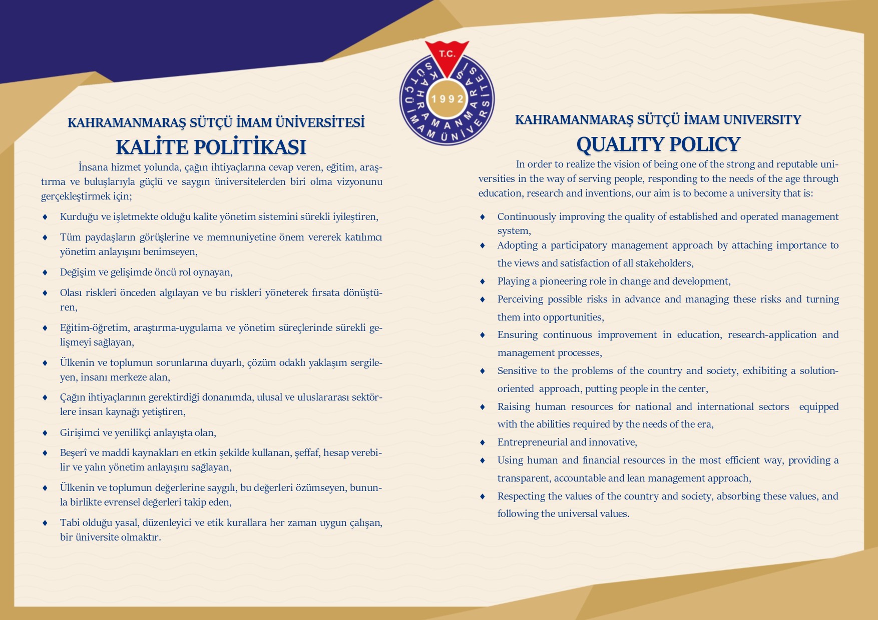 Kahramanmaraş Sütçü İmam Üniversitesi, 11.7.1992 tarih ve 21281 sayılı Resmî Gazete'de yayımlanan 3837 sayılı yasa ile kurularak 1992-1993 Akademik Yılında eğitim-öğretime başlamıştır. Üniversitemiz, kurulduğu günden bu yana her geçen gün kendini yenileyerek ve geliştirerek sosyal, bilimsel ve kültürel etkinlikleriyle yüksek eğitim/öğretim standartlarını yakalamayı ve korumayı ilke edinmiştir.