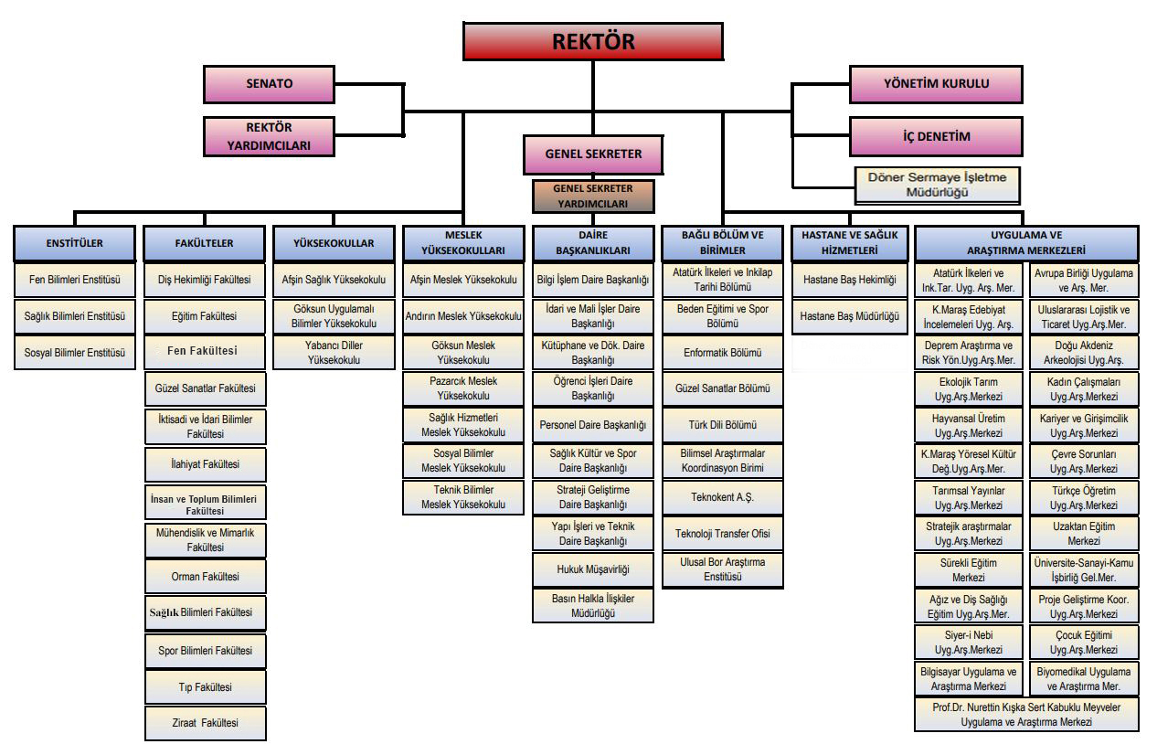 Üniversitemiz; şehir merkezindeki Avşar, Bahçelie3vler ve Karacasu Yerleşkeleri ile Afşin Mahzuni Şerif, Göksun Arslanbey, Andırın, Pazarcık ve Türkoğlu yerleşkelerinden oluşmaktadır.