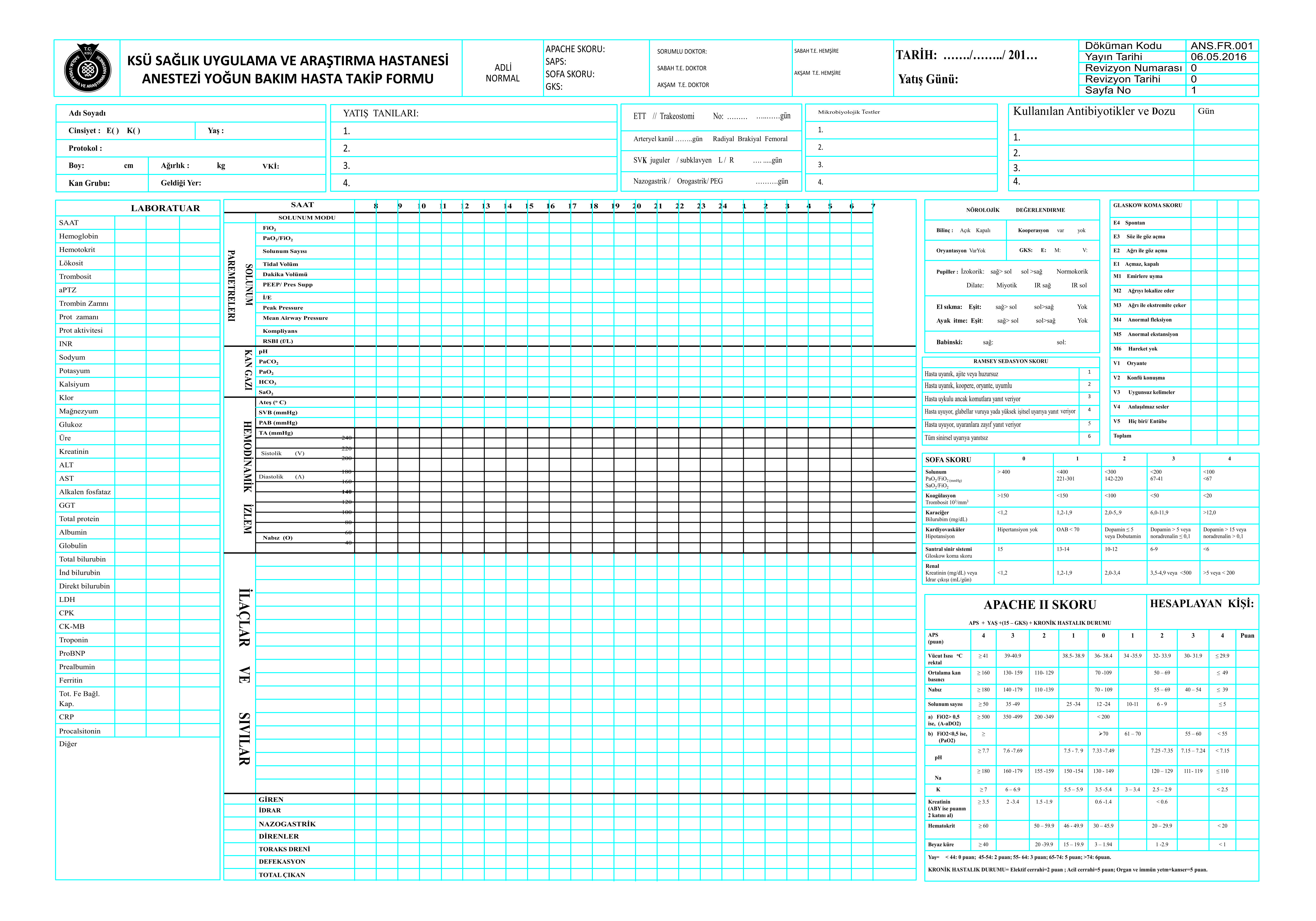 | ANS.FR.001 ANESTEZİ YOĞUN BAKIM HASTA İZLEM FORMU ön YÜZ |