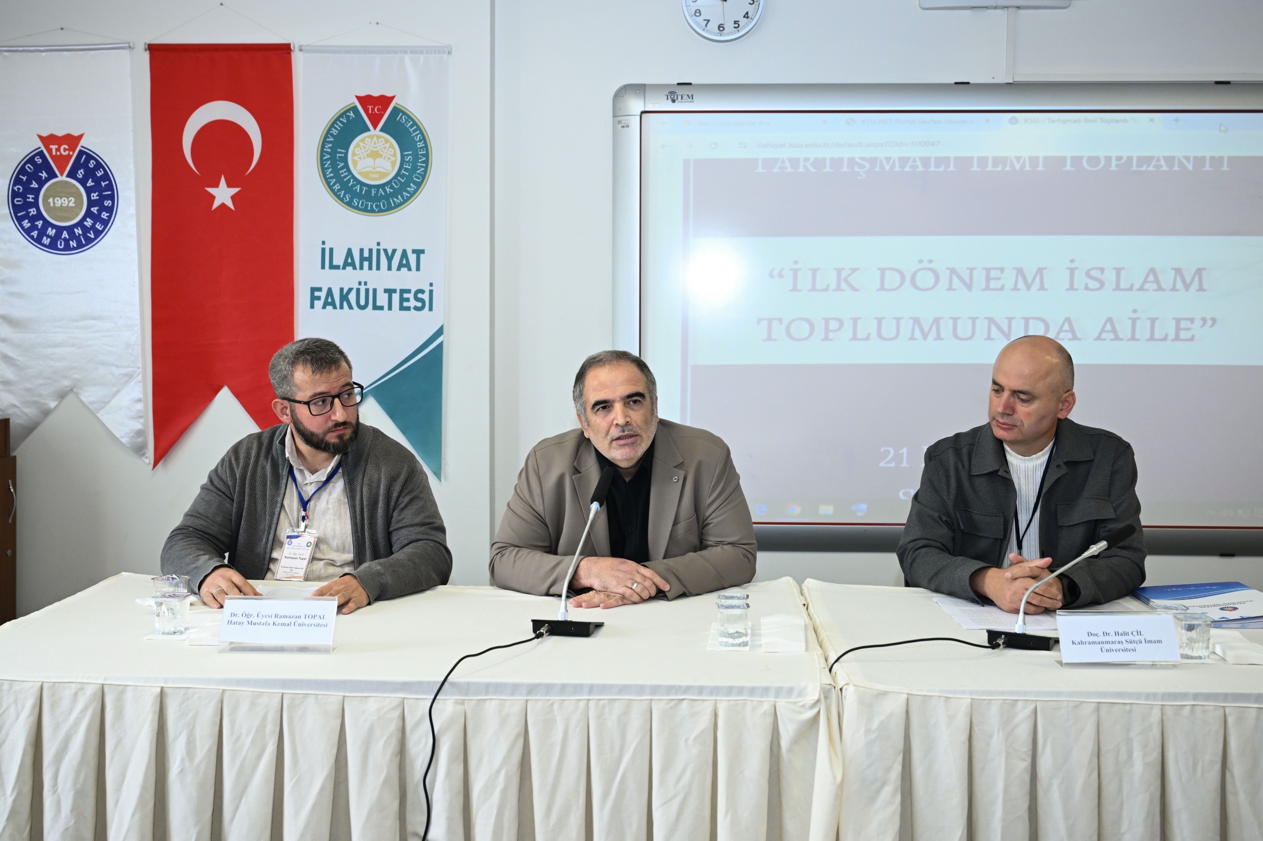 Toplantının ilk oturumunda, “Hz. Peygamber Döneminde Teşekkül ve İşleyişi Bakımından Aile Kurumu” başlıklı tebliğ sunuldu. Oturum Başkanlığını KSÜ İlahiyat Fakültesi İslam Tarihi ve Sanatları Bölüm Başkanı Prof. Dr. Şaban Öz yürüttü. KSÜ İlahiyat Fakültesi Öğretim Üyesi Doç. Dr. Halit Çil, Hatay Mustafa Kemal Üniversitesi’nden Dr. Öğr. Üyesi Ramazan Topal dönemsel kaynaklar ışığında ilk dönem İslam toplumundaki aile yapısının teşekkül sürecine dair değerlendirmelerde bulundu.
