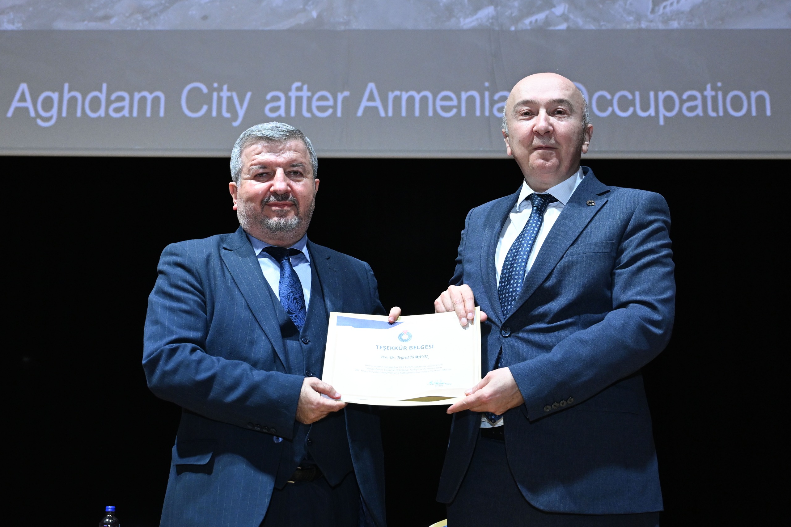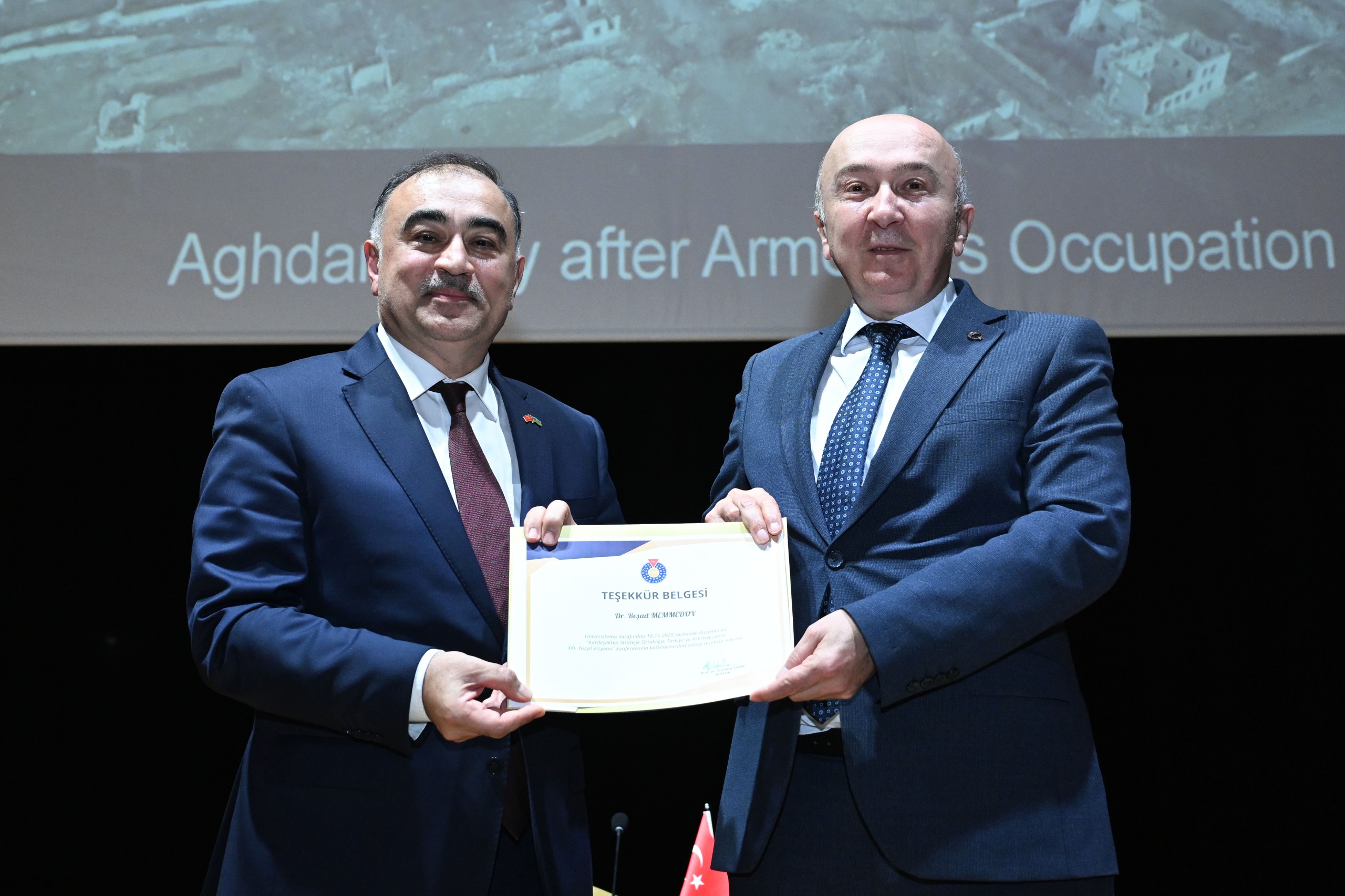 Panel, Rektör Yasım'ın Büyükelçi Memmedov'a belge takdimi ve toplu fotoğraf çekimiyle sona erdi.
