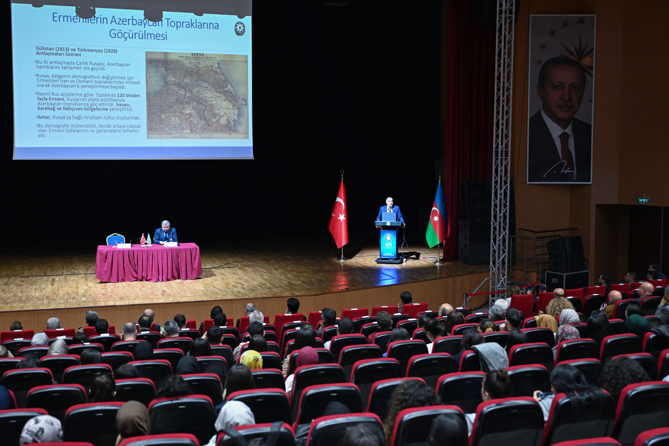Dr. Memmedov, konuşmasında Azerbaycan'ın tarihsel ve coğrafi konumuna değinerek, bölgeye yerleştirilen Ermeniler üzerinden yürütülen Müslümansızlaştırma ve Türksüzleştirme politikalarına dikkat çekti.