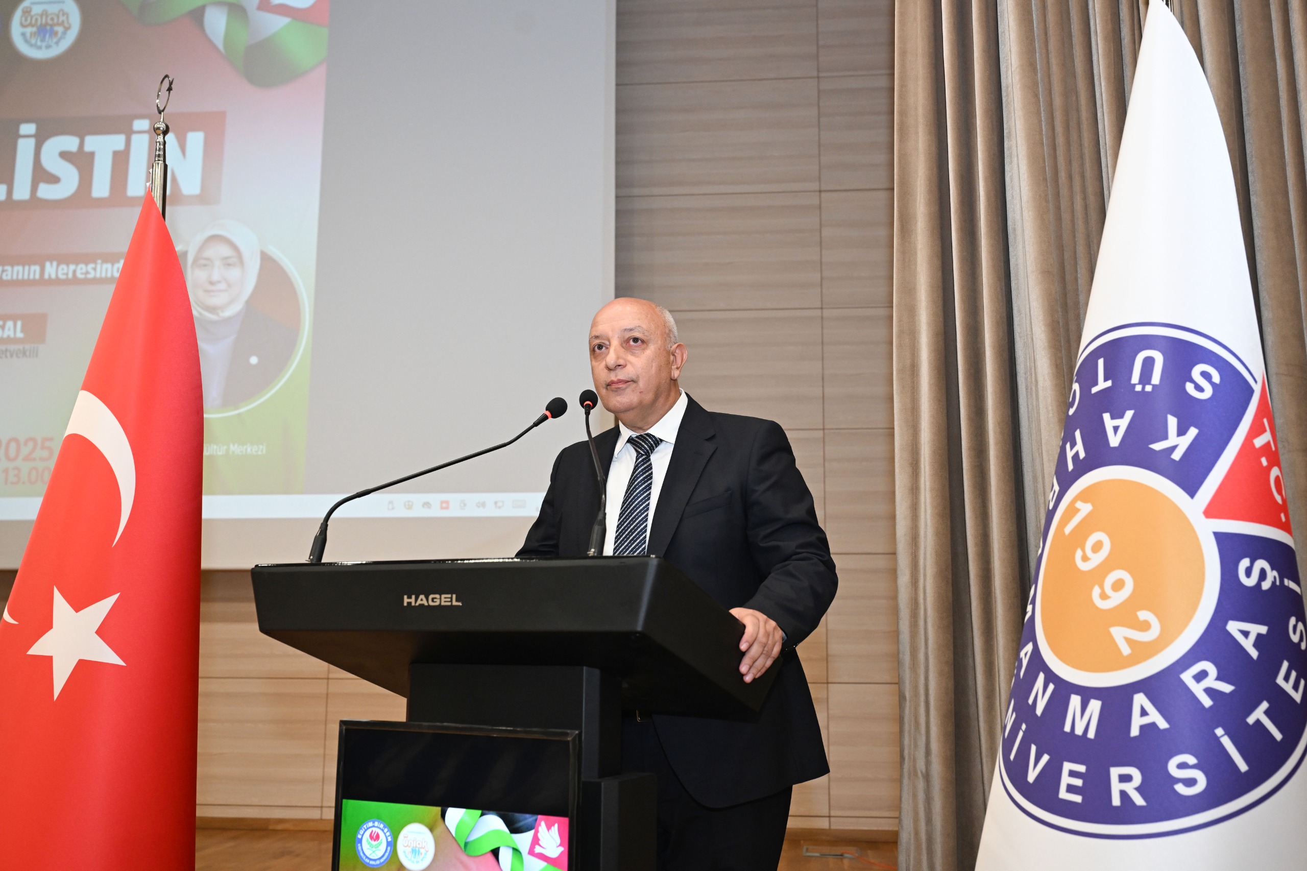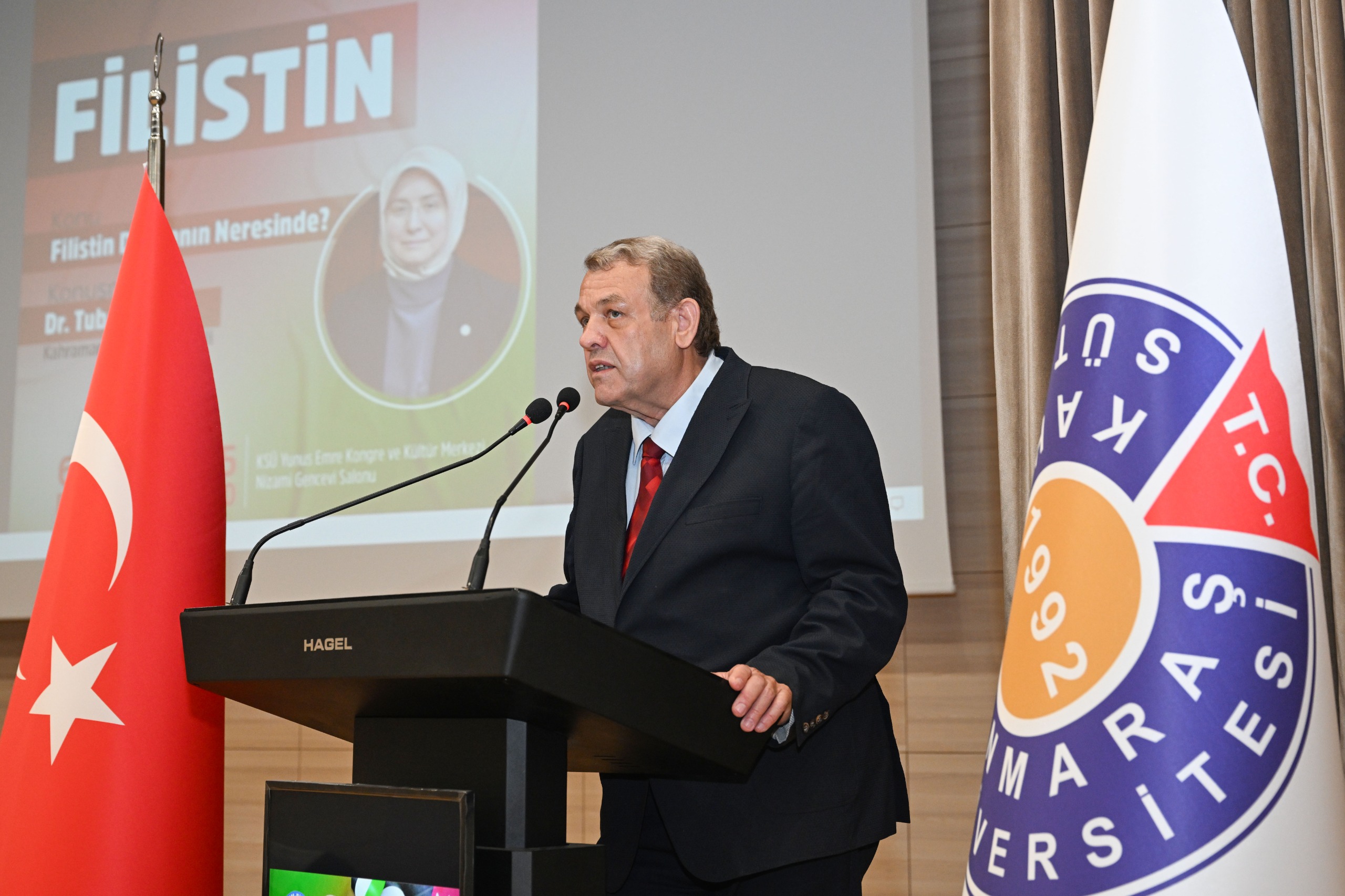 KSÜ Rektör Vekili Prof. Dr. İrfan Ersin Akıncı konuşmasında, “Filistin uzun yıllar bizim gözyaşımız ve yürek ağrımızdı ama artık tüm dünyanın gözyaşı hâline geldi. Çok iyi biliyoruz ki asıl hedef ülkemiz ve Orta Doğu’dur. Bu bilinçle konuyu gündemde tutuyoruz. Terör devleti, soykırımcı İsrail emellerine asla ulaşamayacak. Biz kahraman bir milletiz, korkaklar bize asla zarar veremeyecek.” diyerek emeği geçenlere teşekkür etti ve programın hayırlara vesile olmasını diledi.
