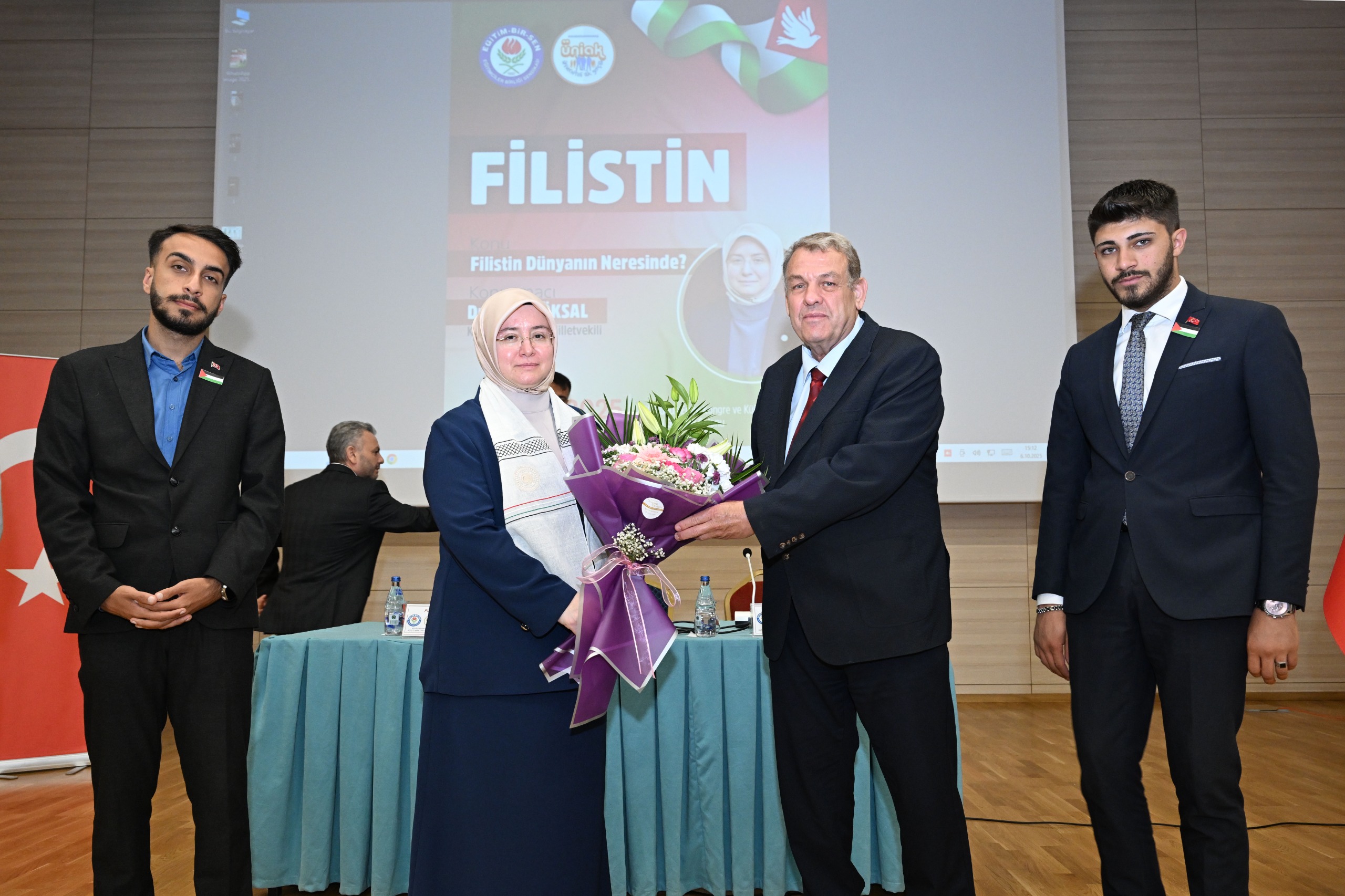 İlahiyat Fakültesi Dekanı Prof. Dr. Ahmet Abay konuşmasında, “Bugün vicdan sahibi olan hiçbir insan ‘Bana ne Gazze’den.’ diyemez. Yaratıcımız bir şeye kutsallık atfediyorsa o, bizim için de kutsaldır. Ümmetten olup da kalbinde Filistin sızısı olmayan bir insan, Kudüs gibi kuşatılmış bir kalbe sahiptir.” dedi. Ardından Cahit Zarifoğlu’nun “Daralan Vakitler” şiirini ve Nurullah Genç’in “Uyan Artık Yiğidim” şiirini okudu.