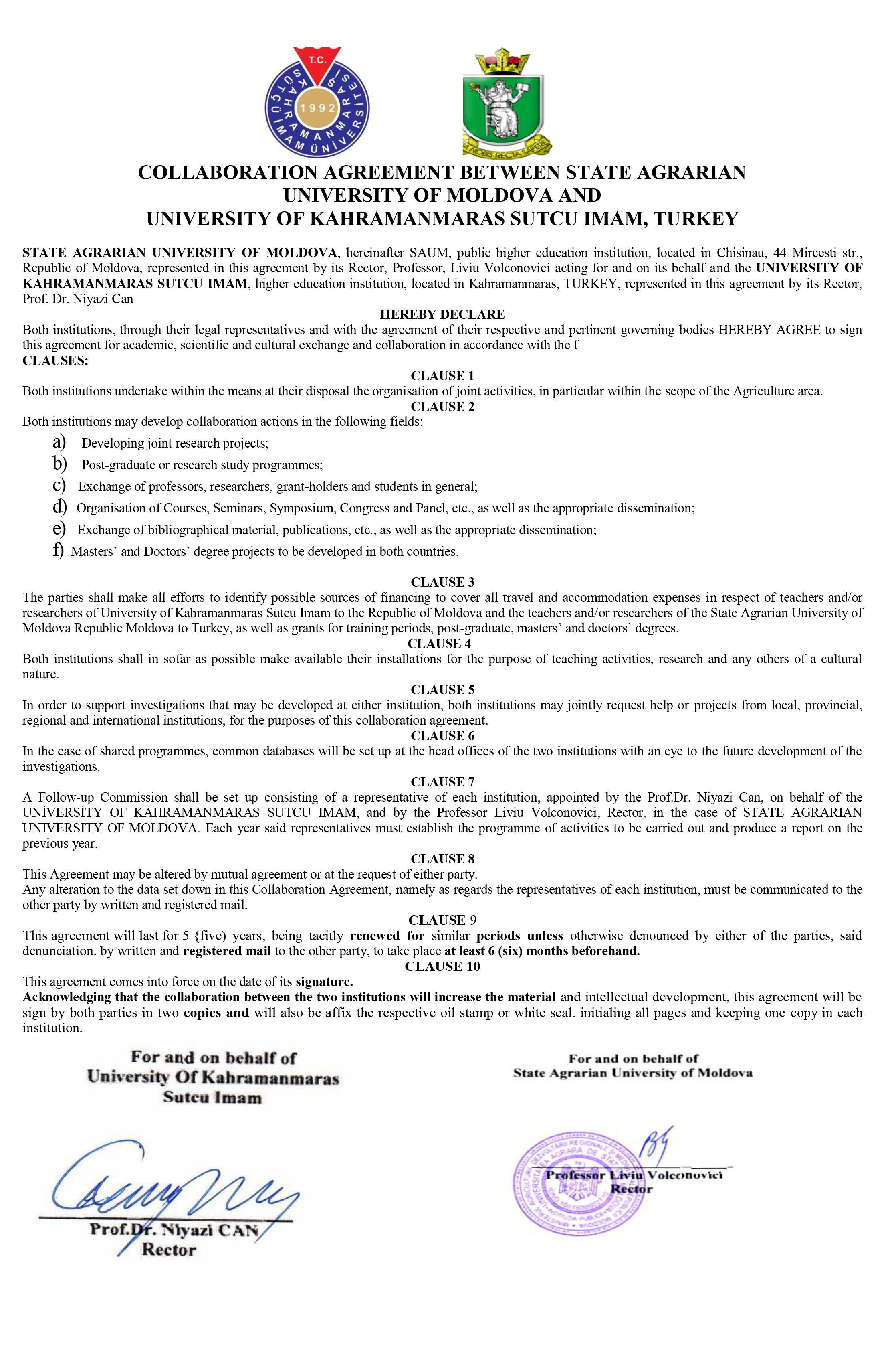 Ayrıca, proje kapsamında Kahramanmaraş Sütçü İmam Üniversitesi ve State Agrarian University of Moldova arasında Rektörlük seviyesinde ikili araştırma ve çalışma protokolu imzalanmıştır.