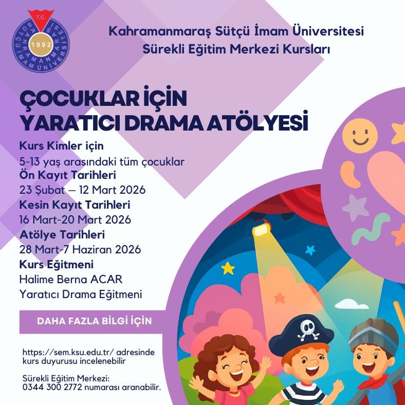 Atölye Ön Kayıt Tarihi: 23 Şubat 2026 Pazartesi - 12 Mart 2026 Perşembe